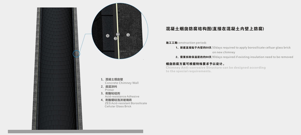 在煙囪領域,我公司可以為煙囪防腐工程提供專業的技術服務,從泡沫玻璃的選擇、方案的設計、施工安裝監督指導、驗收等提供專業的服務。